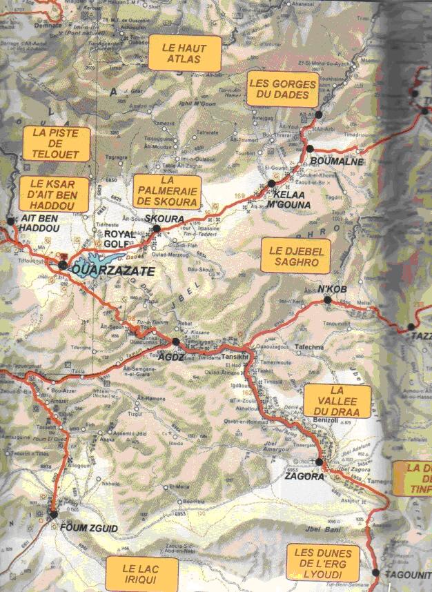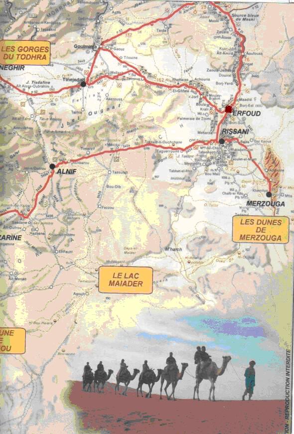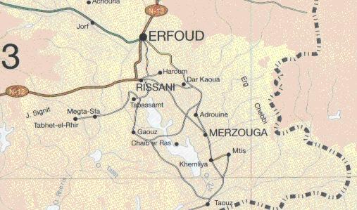 * Departure "of Arfoud" with 8h: 00 on the morning to take the asphalt road which leaves towards "ERRACHIDIA", we go crossed ksar "EL MÂADID" (3, 4 km of Arfoud). * On the asphalt road we go along the dunes "Of IRDI" which are with (6, 2 km of Arfoud), Then we will cross the bridge on wadi "ZIZ" to (9, 2 km of Arfoud). * With the km 11, 2 end of the asphalt road and beginning of the track. * Stop with the first then dug by nomads (11, 7 km of the beginning of the track). * Crossed green landscapes, caves of "ZERZEF", and stop with the tomb stone of one of the participants of the "PARIS-DAKAR" "MOUTH LOUIS MARIUS"